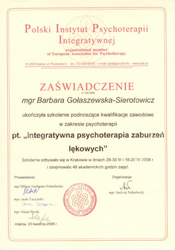 - Polski Instytut Psychoterapii Krótkoterminowej – integratywna psychoterapia zaburzeń lękowych – 2008