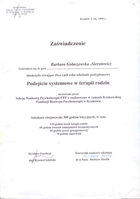 - Krakowska Fundacja Psychoterapii – Systemowa Terapia Rodzin – 1995–1998