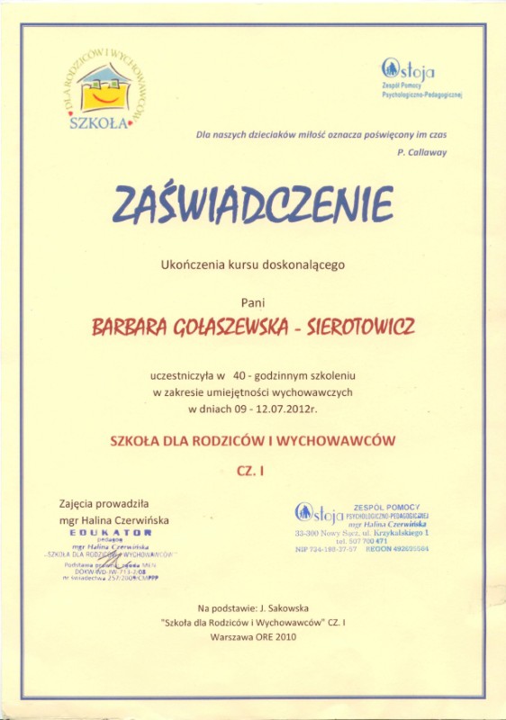 - Polski Instytut Psychoterapii Krótkoterminowej – terapia dzieci moczących się i ich rodzin – 2001