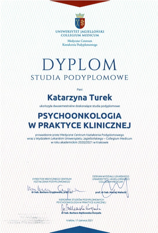 - 2020–2021: Uniwersytet Jagielloński Collegium Medicum w Krakowie (Wydział Lekarski) – Psychoonkolog (2021)