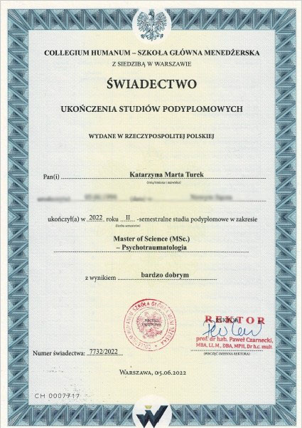 - 2021–2022: Collegium Humanum w Warszawie – Master of Science (MSc), Psychotraumatolog (2022)