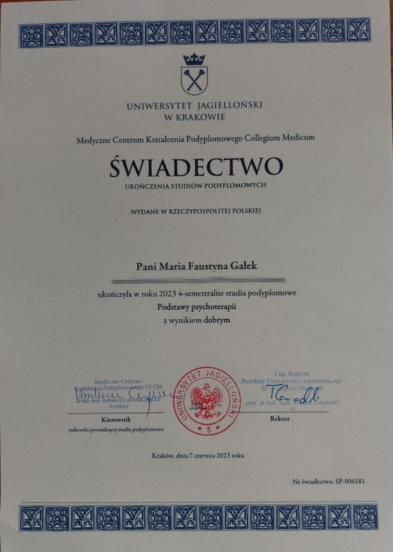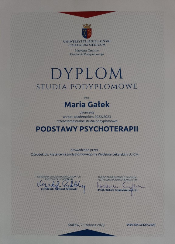 • 2021–2023: Uniwersytet Jagielloński (Podstawy psychoterapii, studia podyplomowe) – Studia podyplomowe (2023)