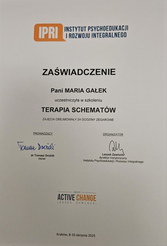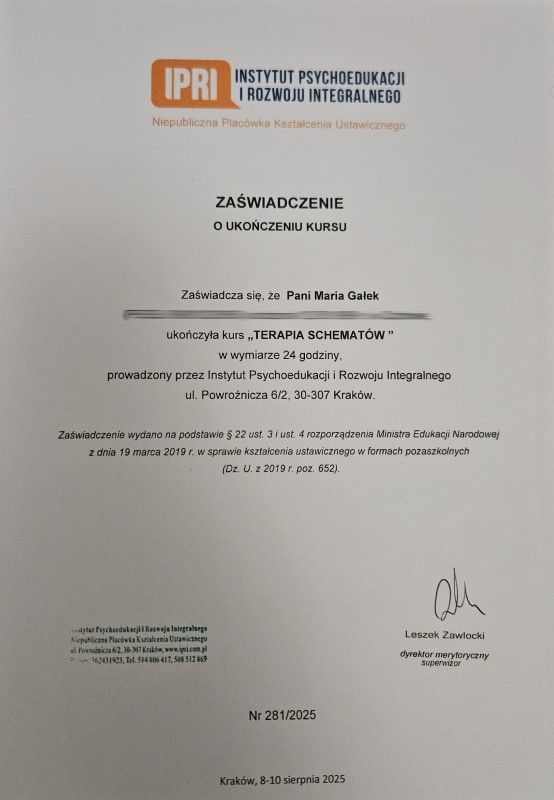 W pracy terapeutycznej Maria skupia się na uważnym towarzyszeniu, dokładnym rozumieniu emocji i odkrywaniu wewnętrznych schematów, które wpływają na codzienne funkcjonowanie. Korzyścią dla pacjentów jest połączenie wiedzy klinicznej z wieloletnim doświadczeniem w pracy w środowisku szkolnym, poradniach i projektach wsparcia psychologicznego. Jej kompetencje rozwijane są poprzez regularne szkolenia oraz pracę pod superwizją, co zapewnia wysoki poziom profesjonalnej pomocy.