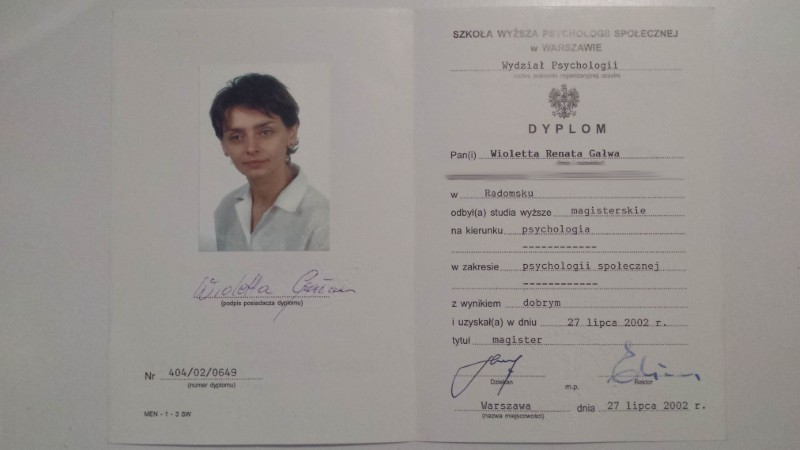 - 2002: Szkoła Wyższa Psychologii Społecznej (Psychologia) – magister psychologii (2002)