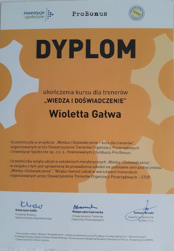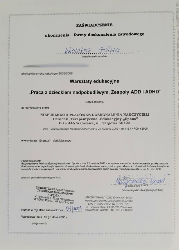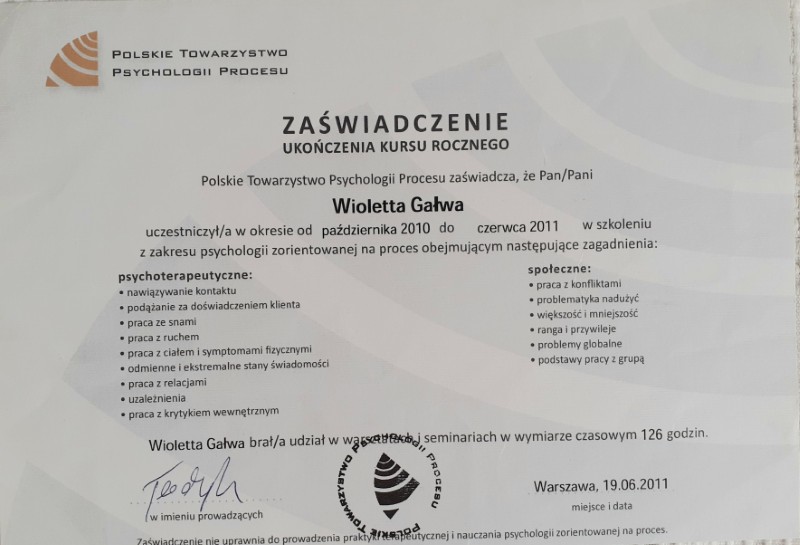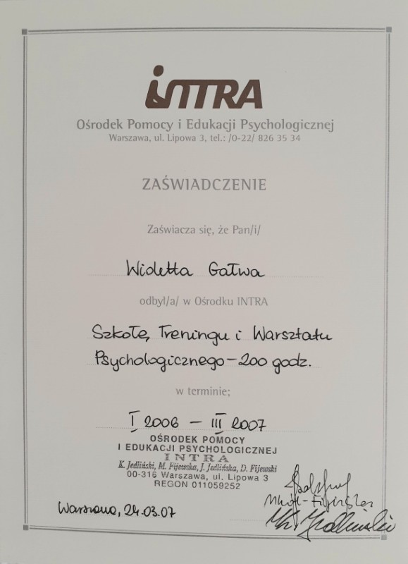 - Certyfikowane Studia Podyplomowe – Szkoła Psychologii Zorientowanej na Proces – 2007